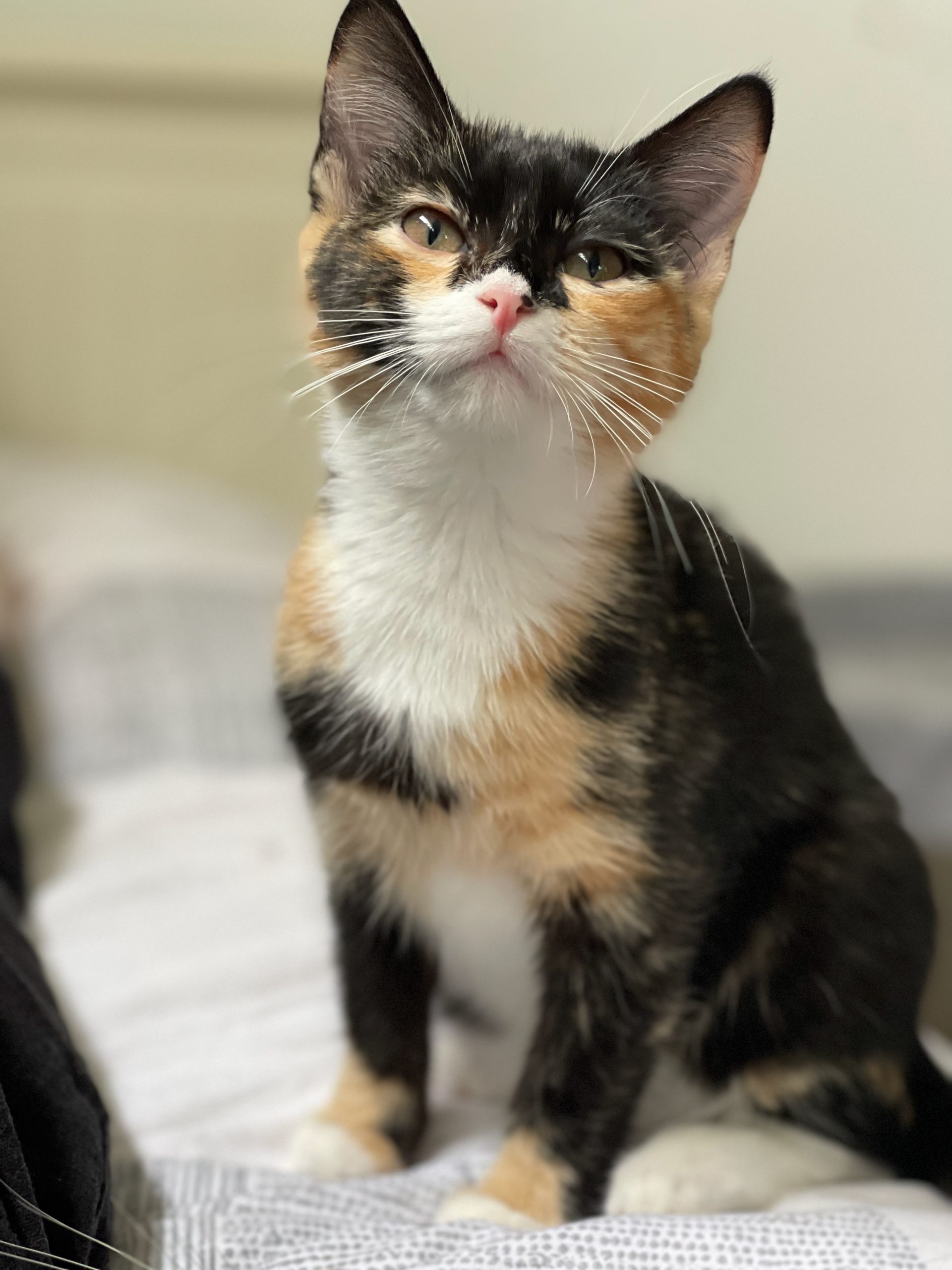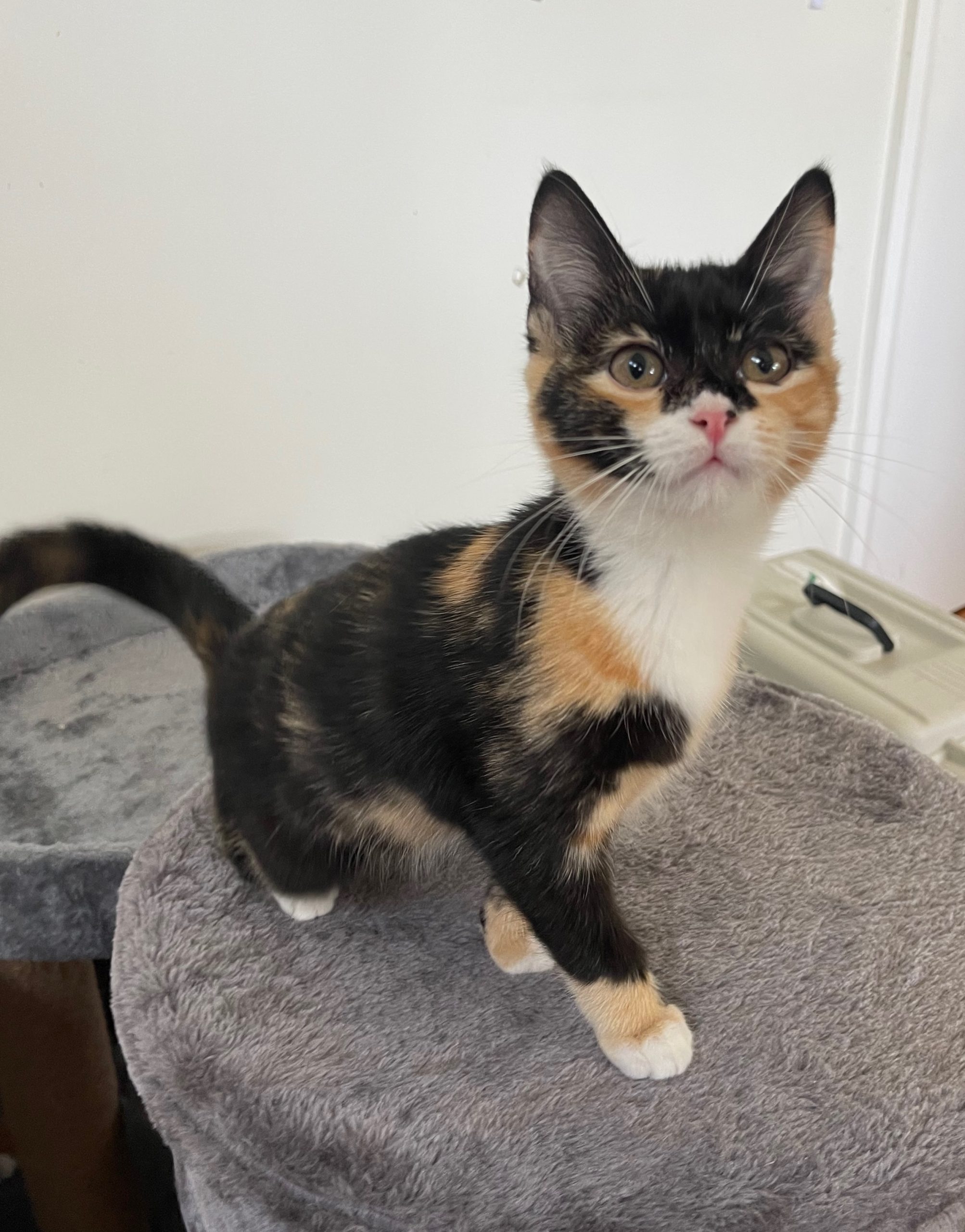 Buttercup is a friendly, confident kitten who is comfortable around people and settles in quickly. She handles being picked up well and often starts purring straight away. She likes being near her people and will follow them around the house.
