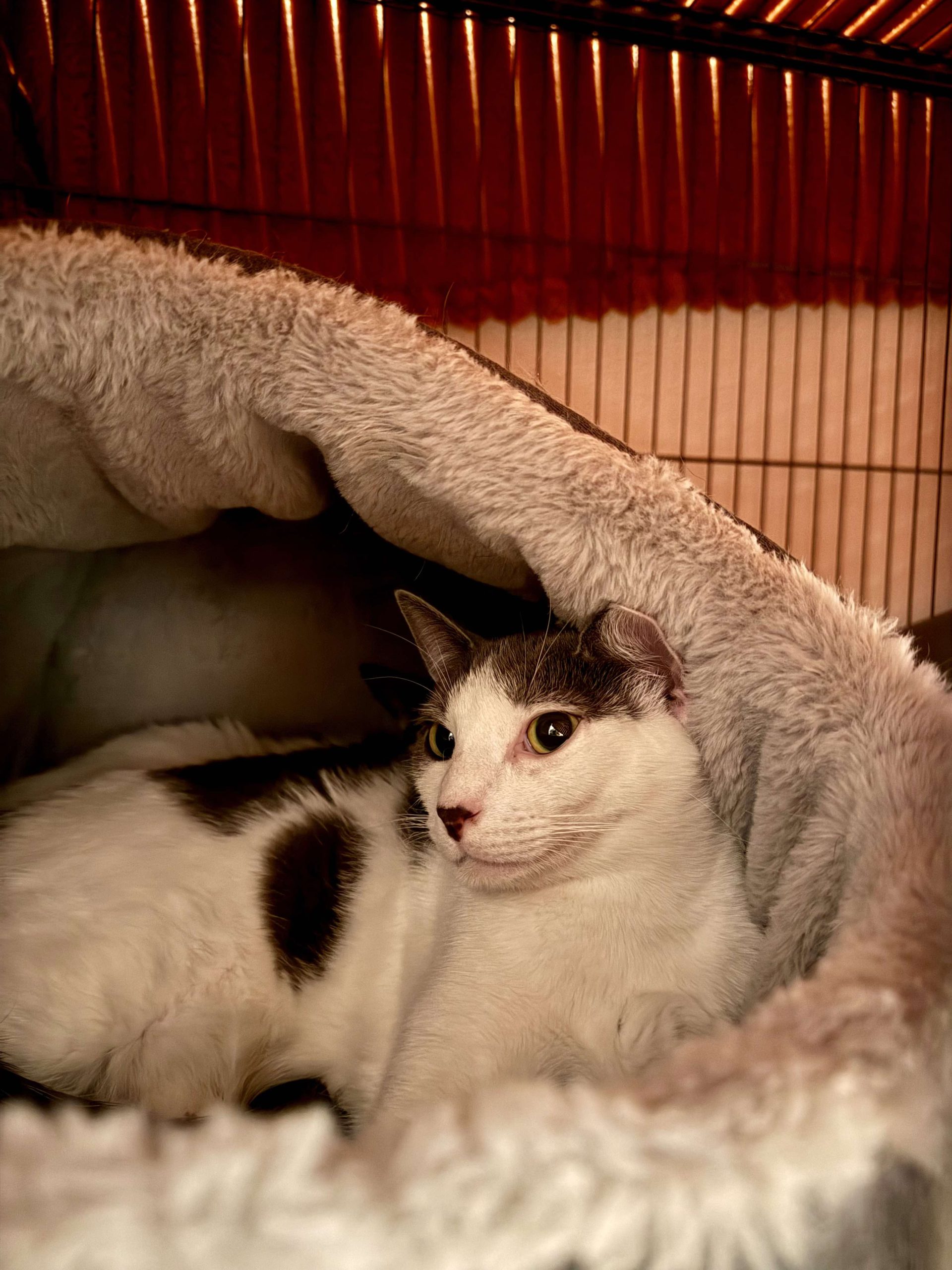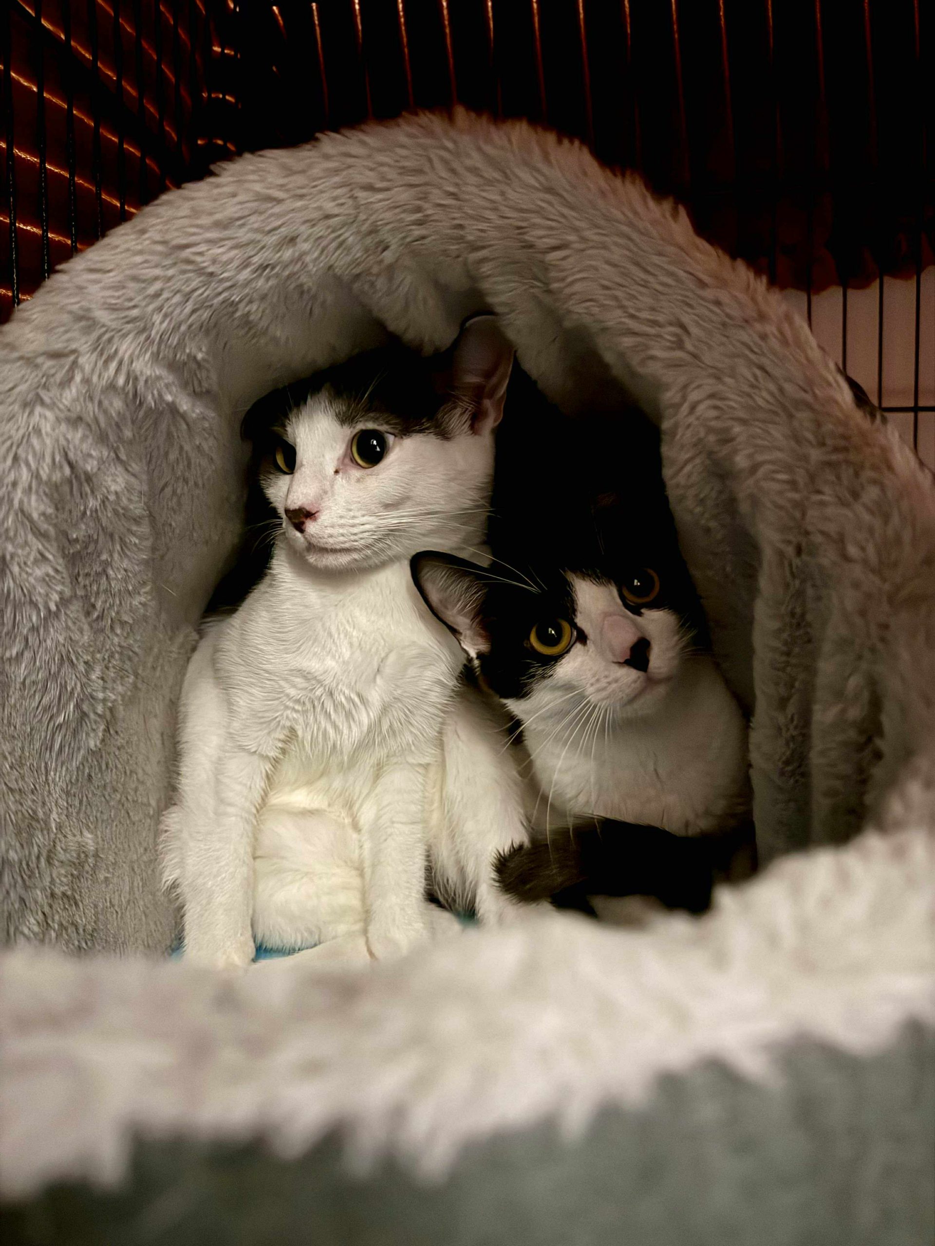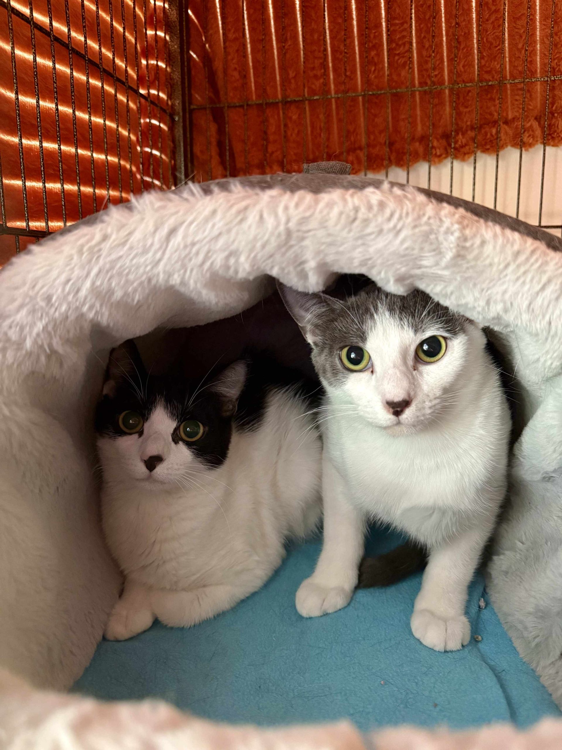 Daisy and Boo are a sweet bonded pair who are looking for a quiet and patient home together. Both are shy at first and will need a little time to settle in, but once they feel safe, their playful and affectionate sides shine through. Daisy enjoys gentle pats and cuddles, while Boo prefers to show his affection through play. They both love wand toys, chasing games, and spending time with other friendly cats.
