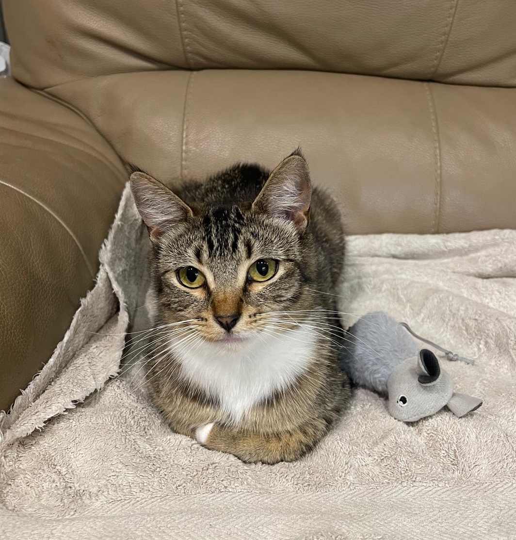 When playtime is over, Mai enjoys being close to her people, often choosing to sit or lie nearby rather than curl up in your lap. She values her personal space and will let you know when she’s comfortable, making her a great match for someone who respects feline boundaries.