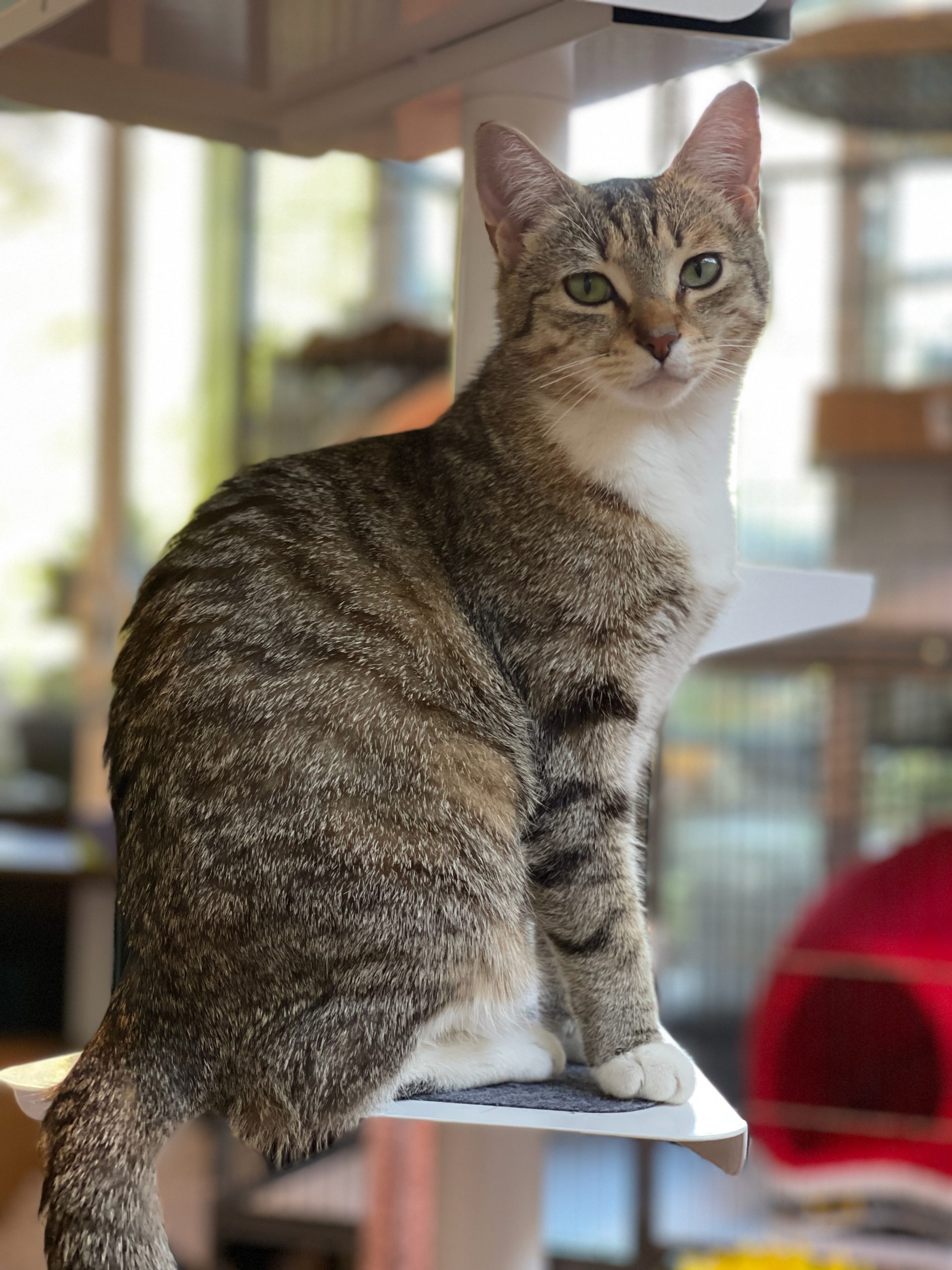 If you’re looking for a young cat with a sweet nature, plenty of personality, and a steady motor, Rowan would be a great fit. She’ll happily join a home that can give her company, playtime, and kindness.