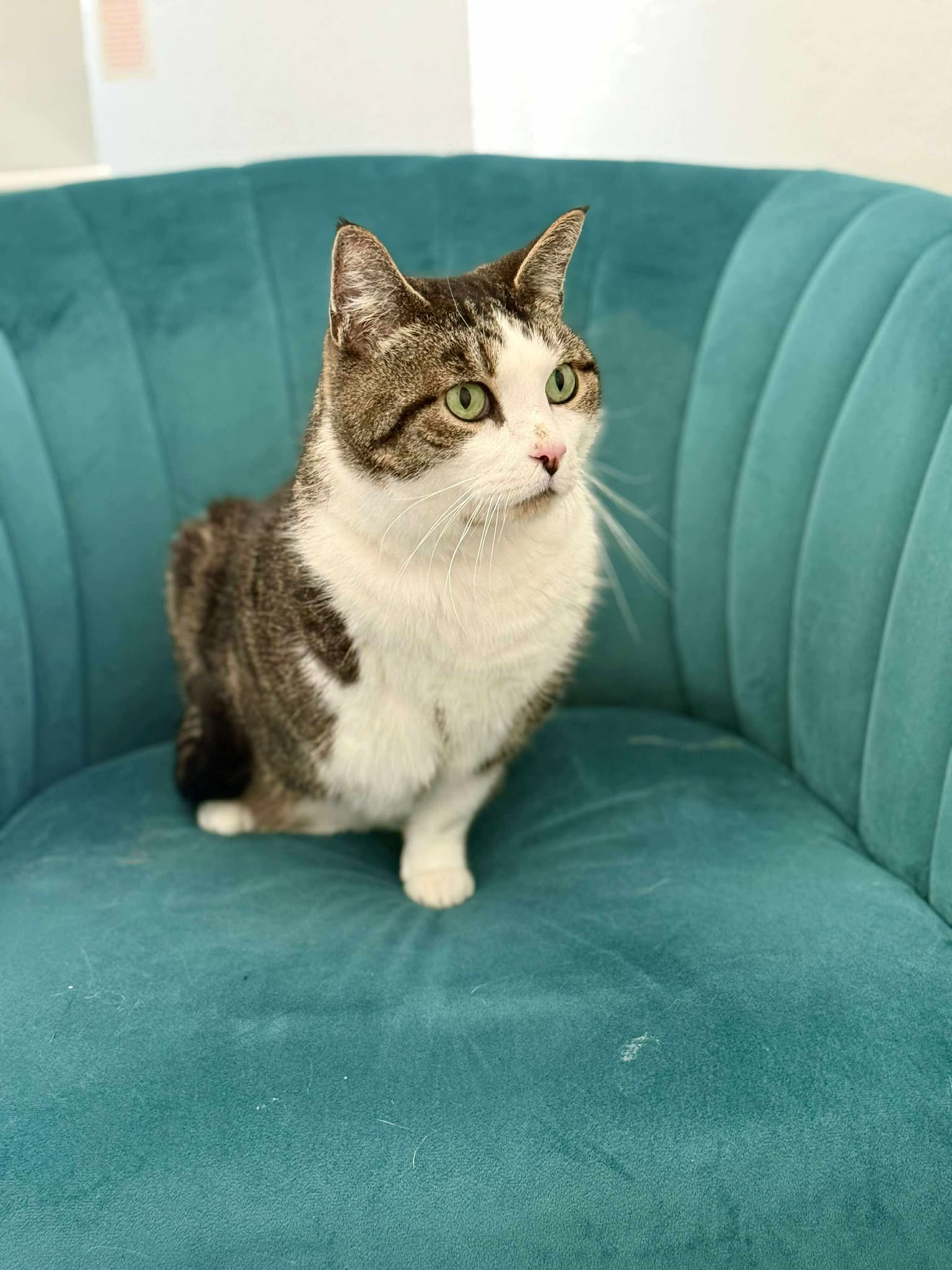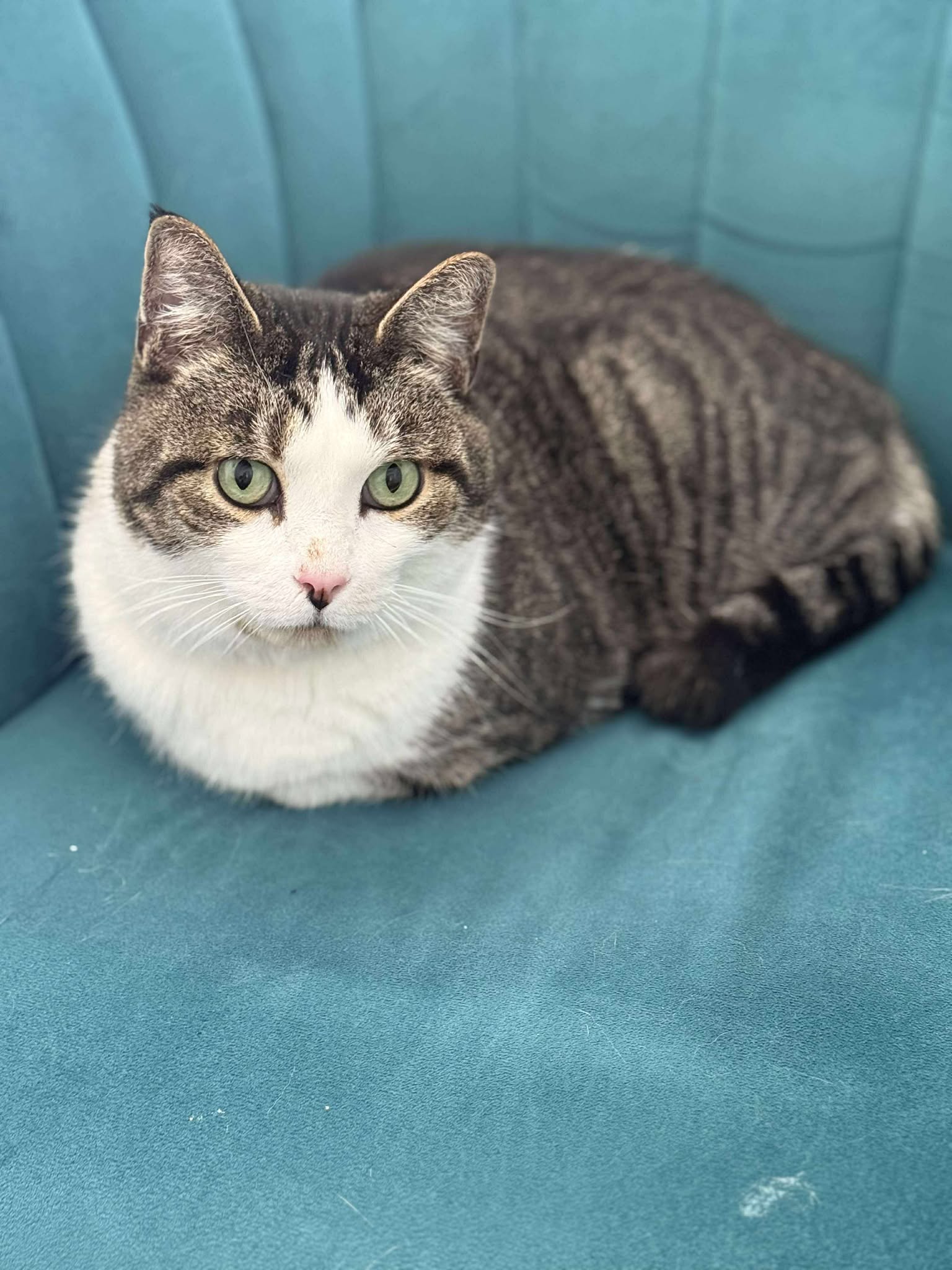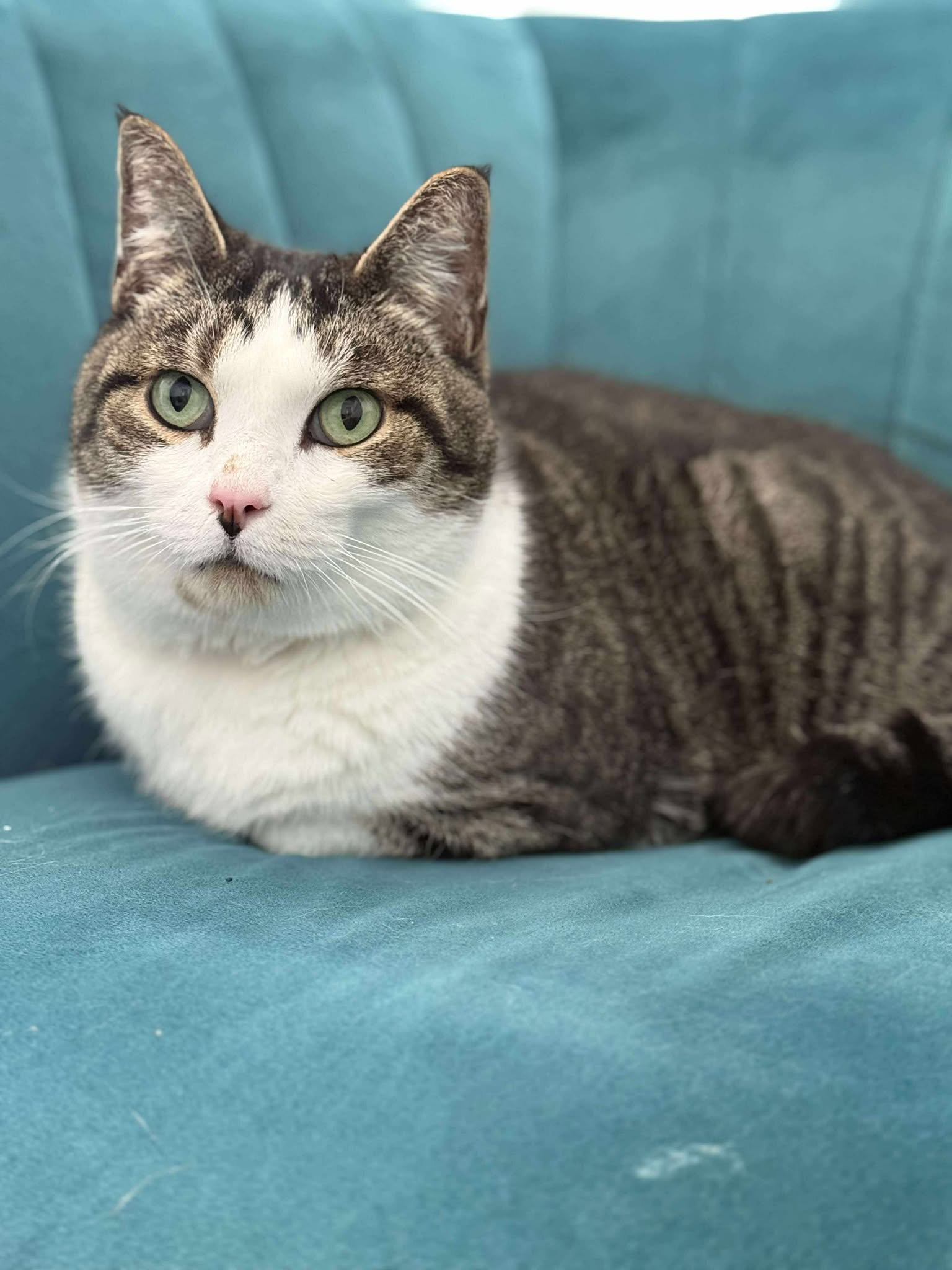 My name is Trilby-I’m a 6 and 1/2 year old domestic shorthair cat with 3 legs…but what I’m missing in parts, I make up for in personality! They tell me I had an accident with a car as a kitten, no prizes for guessing who came off second best, but one less front leg hasn’t stopped me having a normal indoor cat life…I can easily jump onto laps, couches and beds to give lots of loving cuddles and purring.